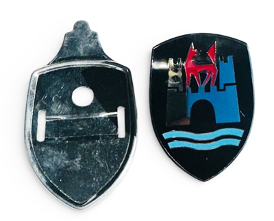 This is the Wolfsburg Castle hood crest, black color with aluminum base, Fits beetle 1955-1967.